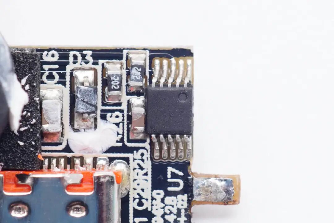 USB-C接口同样采用一路独立降压电路,接口侧设置了一颗固态电容、一颗降压电感,此外还有一颗MCU。