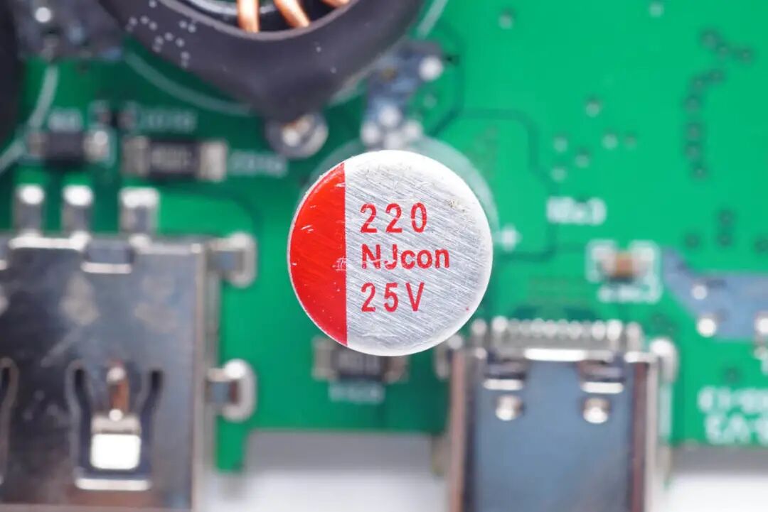 另一颗云星固态滤波电容特写,规格也是25V 220μF,分别用于USB-C1口输入输出滤波。