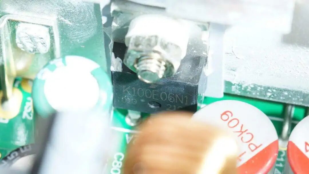 散热片另一面还有两颗LLC开关电源同步整流管,螺丝固定。