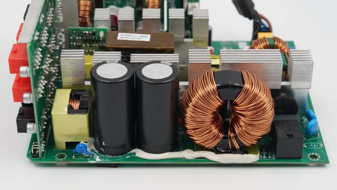 输出端小板正面主要设有接线插座和滤波电感和电容。
