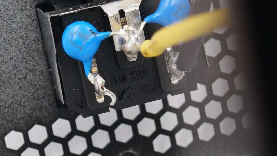 输入插口外壳套有金属片,并焊接两颗Y电容。