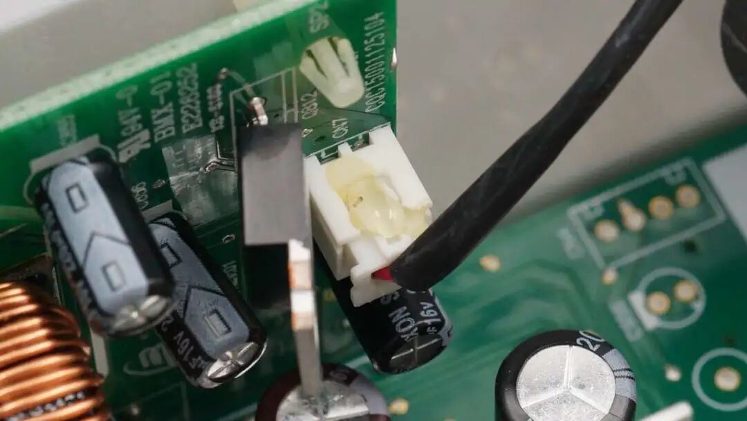 右侧一角设有两颗Y电容、NTC浪涌抑制电阻、滤波电容以及延时继电器。