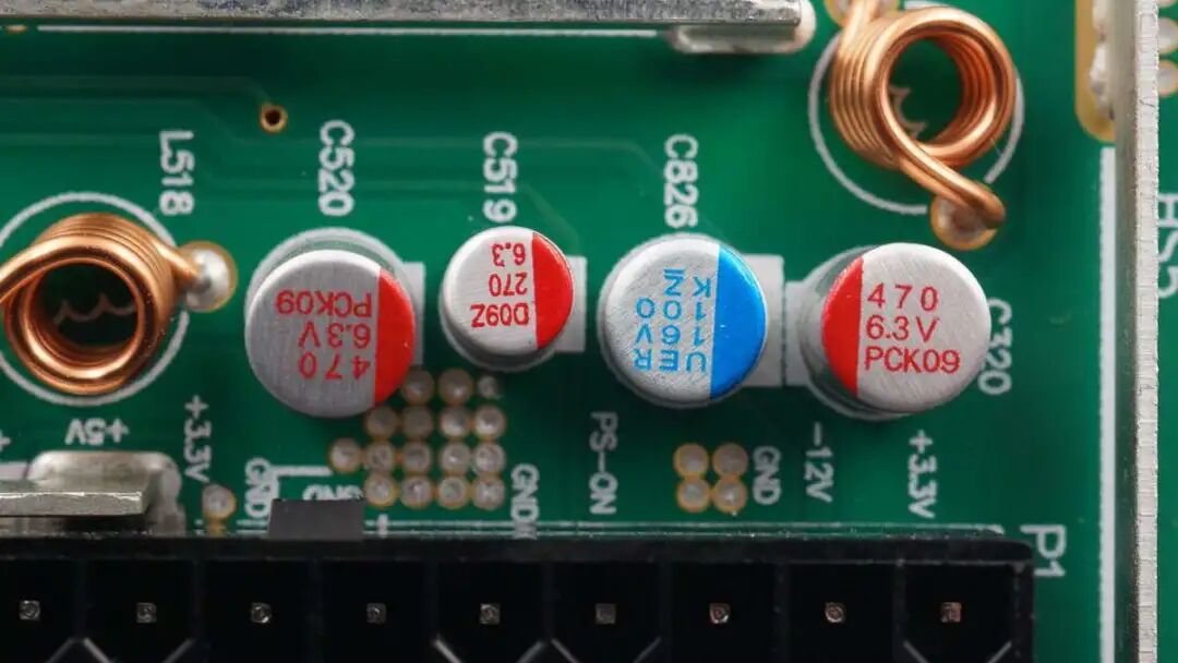 滤波电容特写,分别是6.3V 470μF、6.3V 270μF以及16V 100μF三种规格。