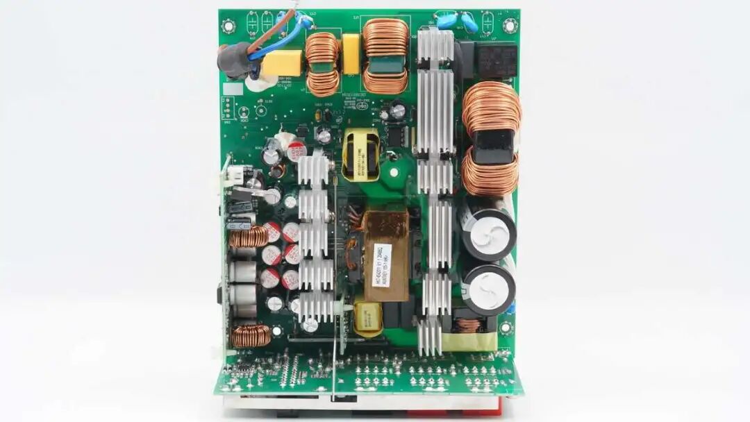 电源模块主板正面一览,最上端设有安规X电容和共模电感等,右侧设有PFC升压电路以及高压滤波电容等,中间设有辅助电源电路、变压器、同步整流输出电路,左侧焊接一块DC-DC二次降压小板,底部焊接输出小板。