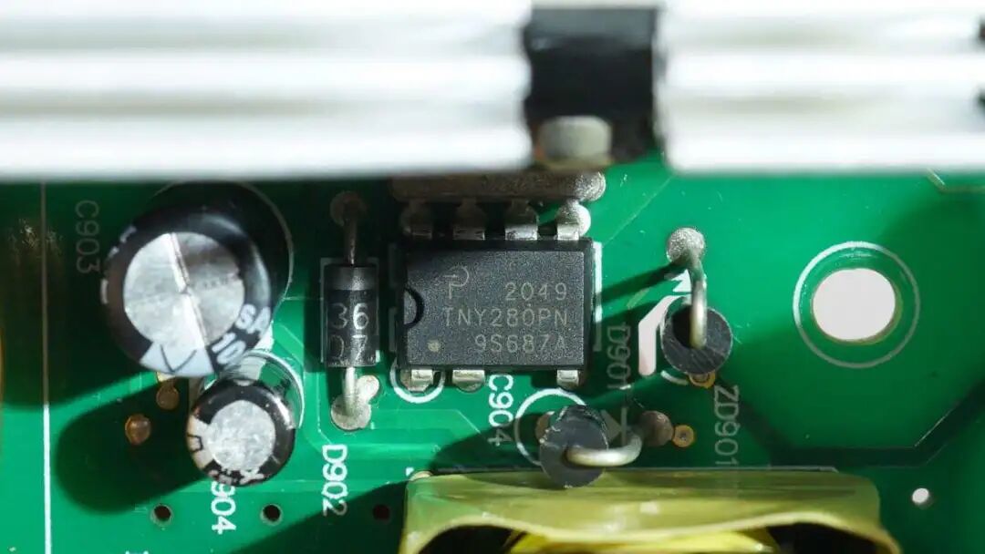 辅助电源控制器采用PI TNY280P,这是一颗灵活性更高、功率范围更大的高效率离线式开关IC。芯片左侧设有供电电容和滤波电容。