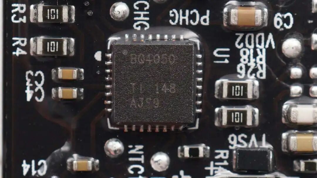 刮去上面的封胶,是TI BQ4050 1-4串锂离子电池组管理器,支持独立的电池保护和电池均衡。