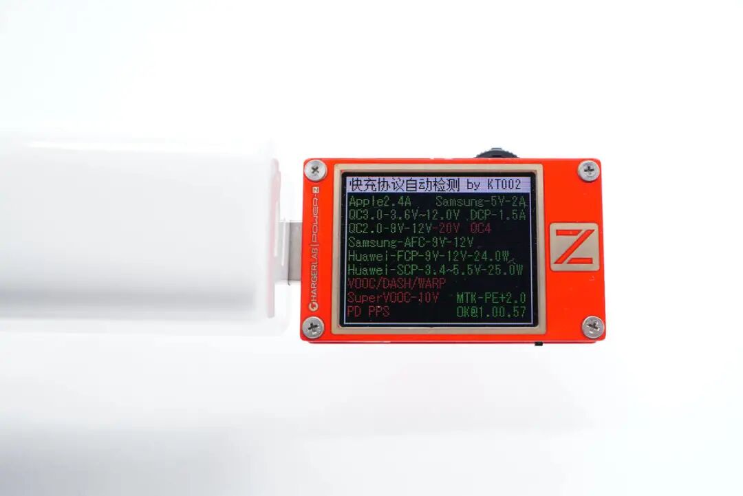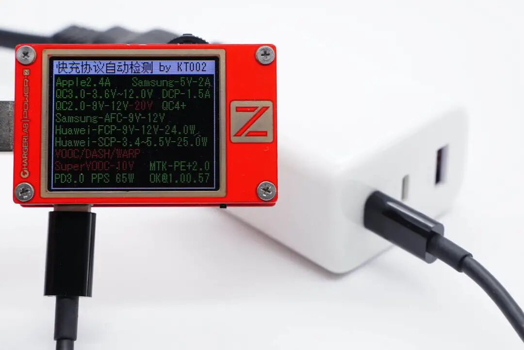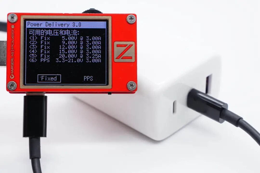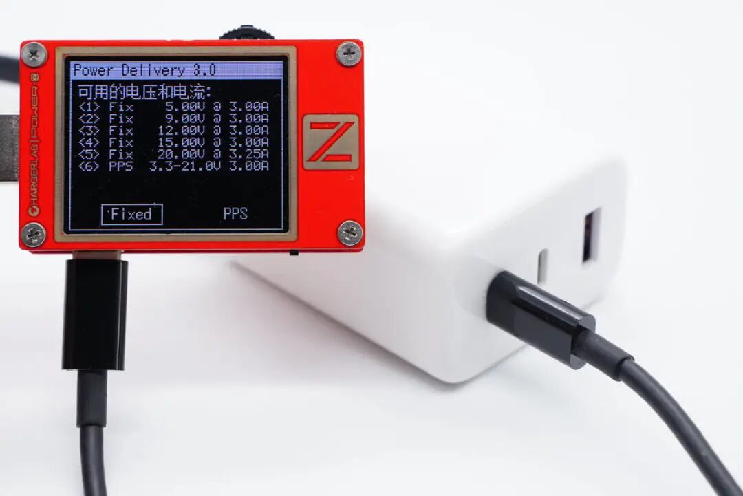 使用ChargerLAB POWER-Z KT002测得USB-C1口支持Apple 2.4A、Samsung 5V2A、DCP协议,以及QC2.0/3.0、AFC、FCP、SCP、PE2.0、PD3.0、PPS多个快充协议。