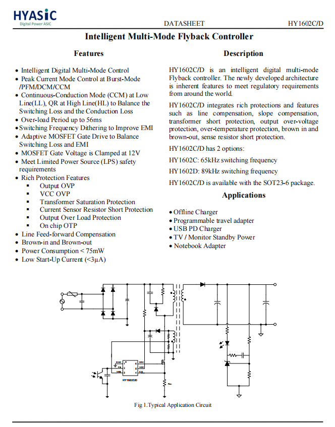 华源智信HY1602是一颗智能多模式反激控制器,集成丰富的保护和特性,包括输入线电压补偿、变压器短路保护、过热保护、输出过压保护、输入欠压保护和取样电阻短路保护。