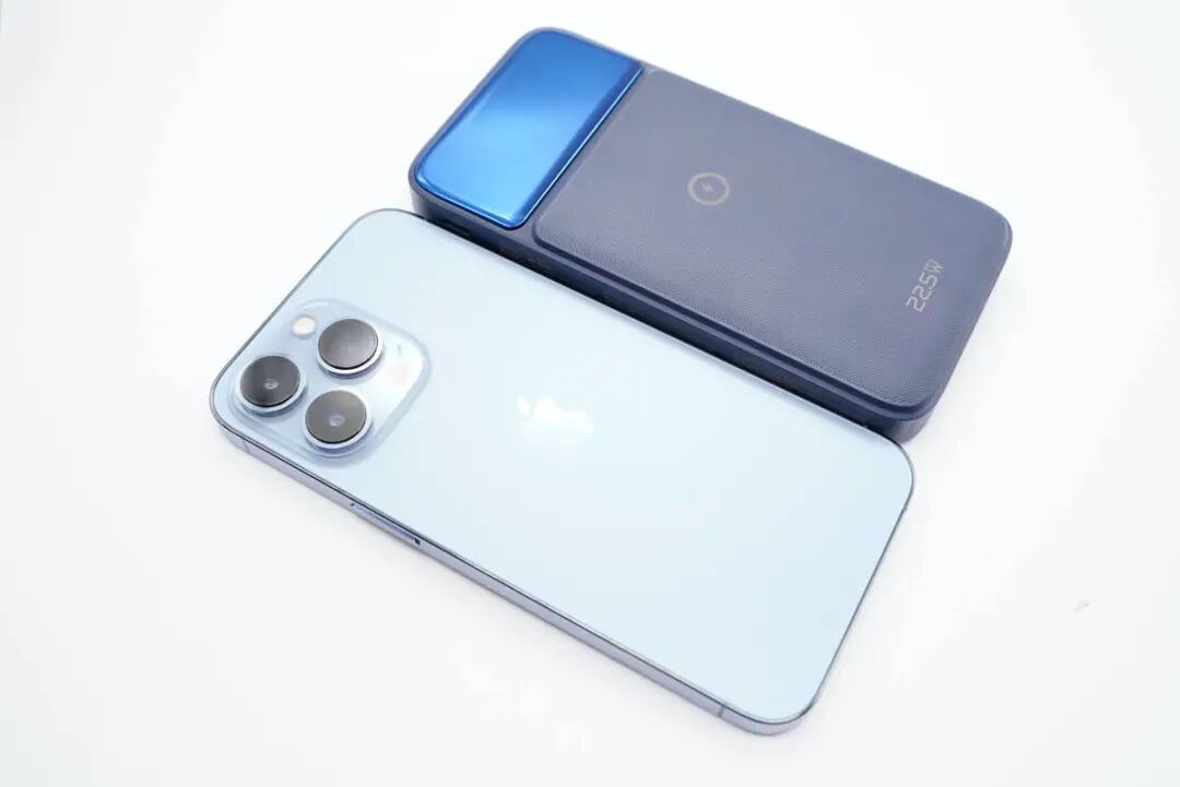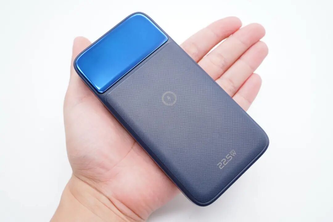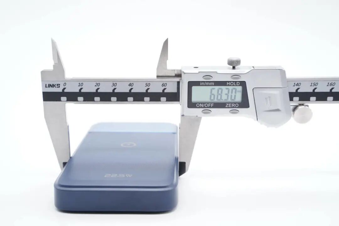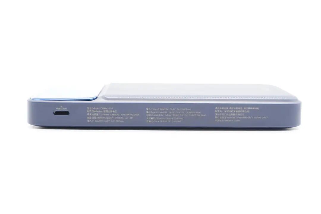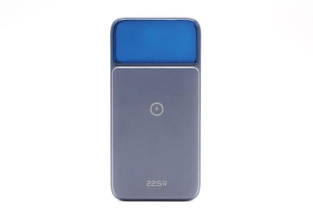 机身正面是亮面板和斜纹理双重设计,中心印有无线充标识,底部印有22.5W字样,表明产品既支持磁吸无线充,也支持PD 20W、华为22.5W等热门有线快充。
