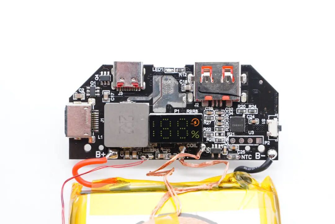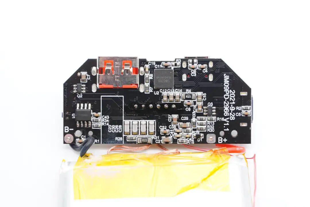移动电源主控芯片采用智融SW6208。这是一款高集成度的多协议双向快充移动电源专用多合一芯片,支持 A+A+B+C+L口任意口快充。其集成了5A高效率开关充电,22.5W高效同步升压输出,支持PPS、PD、QC、AFC、FCP、SCP、PE、SFCP等多种快充协议,电量计量,数码管/LED灯显示以及相应的控制管理逻辑。外围只需少量的器件,即可组成完整的高性能双向快充移动电源解决方案。