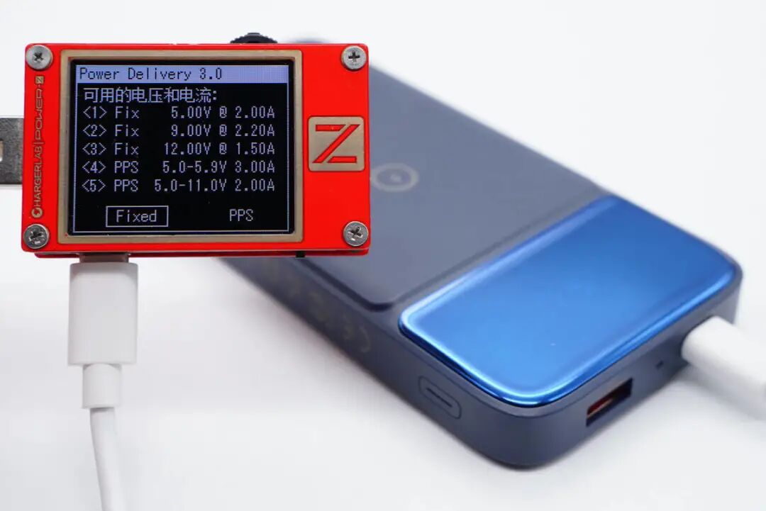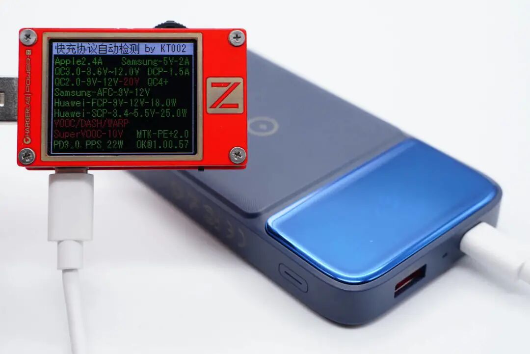 使用ChargerLAB POWER-Z KT002测得C口支持Apple 2.4A、Samsung 5V2A、DCP协议,以及QC2.0/3.0、AFC、FCP、SCP、PE2.0、PD3.0、PPS多个快充协议。
