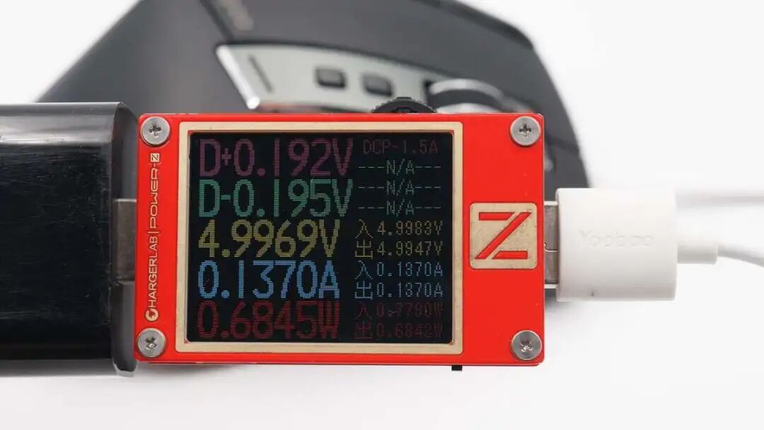 使用充电器直接鼠标进行有线充电,使用ChargerLAB POWER-Z KT002测得输入功率为5V 0.14A 0.68W。