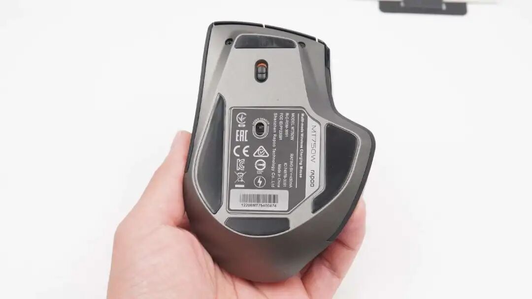 底部设有电源开关,并贴有铭牌,产品型号MT750W,额定输入5V0.45A,鼠标已经通过了EAC、CE和KC认证。