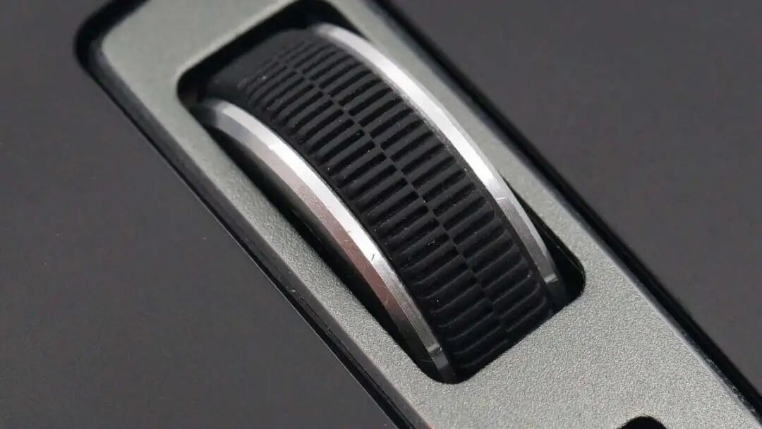 侧边设有设备指示灯、侧滚轮、后退键以及前进键。此外这一侧采用棱格纹理大侧翼设计,可以很好承托拇指。