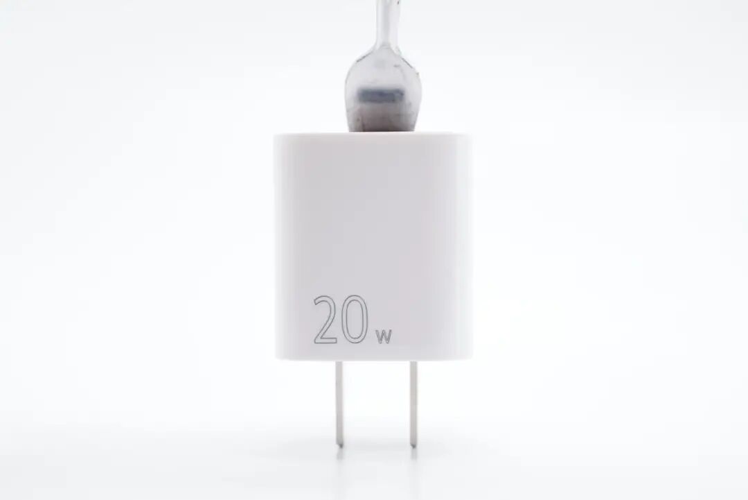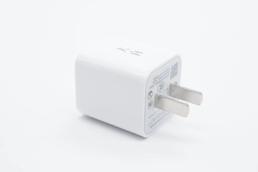 充电器采用PC阻燃材质白色外壳,腰身高光亮面处理,顶面磨砂。