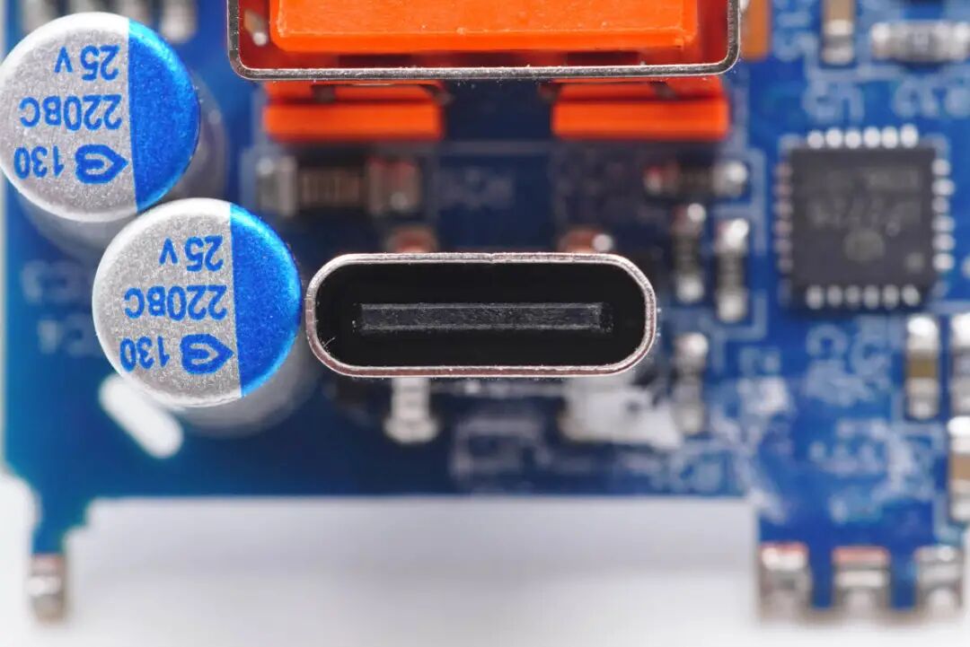 垂直小板正面设有两颗固态电容、同步整流芯片、协议芯片和输出VBUS开关管。