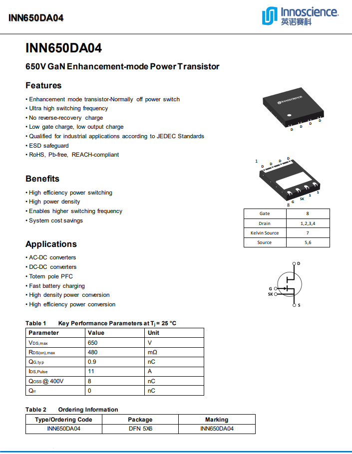 氮化镓功率芯片采用英诺赛科INN650DA04,耐压650V,导阻480mΩ(max),具备高频高效、极低损耗、快速主动散热等特点,同时采用DFN5*6封装,实现小体积、高效率的充电器设计。