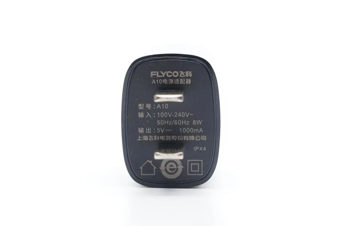 标配的充电器采用黑色亮面机身,固定插脚设计,机身上印有FLYCO的标志。