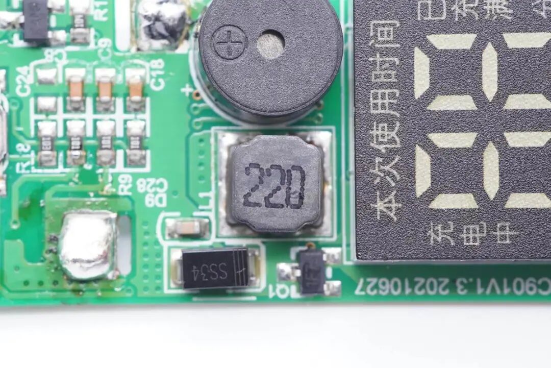 主控PCB板正面居中是一块大数显屏,同时还设有电感、蜂鸣器、电源按键等。