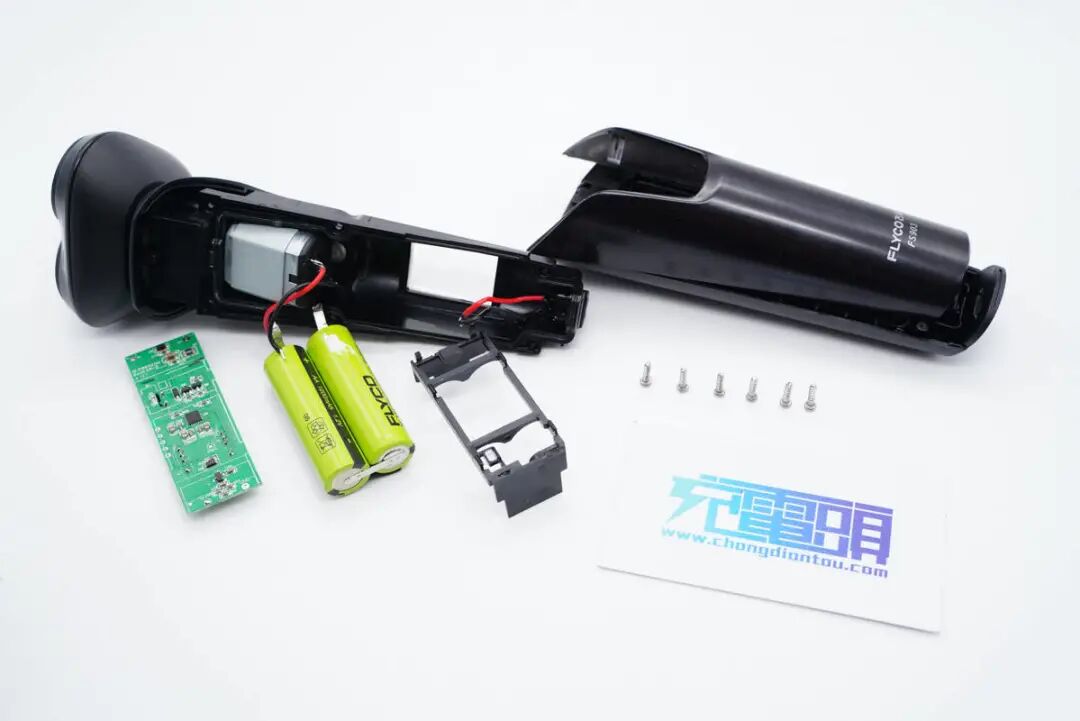 充电头网拆解发现,飞科这款剃须刀内部采用了两颗FLYCO定制的镍氢可充电电池,串联电压2.4V为主控PCB板供电,同时采用了一颗FLYCO自主研发的主控芯片,集成度高,功能全面。