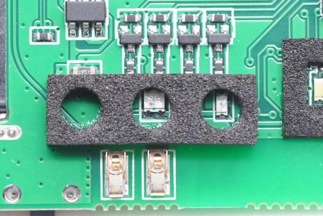 拆掉螺丝可以看到,PCB板另一面中间区域覆盖屏蔽罩,并贴有导电海绵。