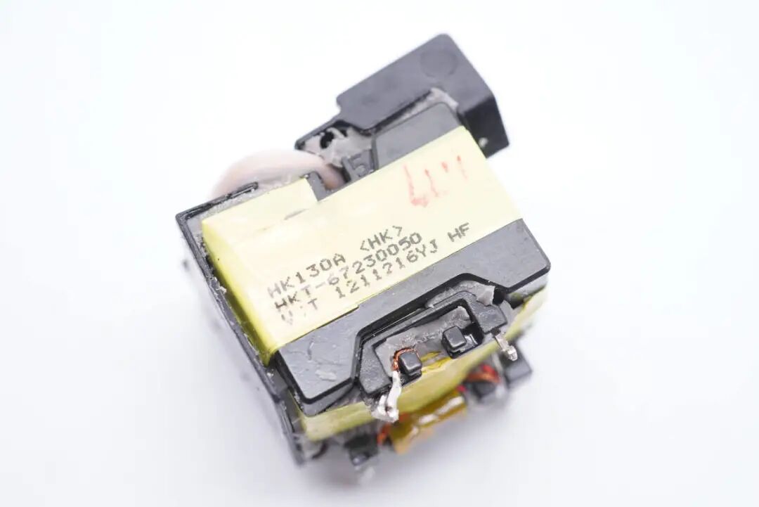 另一侧设有高压滤波电解电容、主控芯片供电电容、变压器以及滤波电感,变压器外套塑料壳,电容以及电感包裹绝缘胶带。