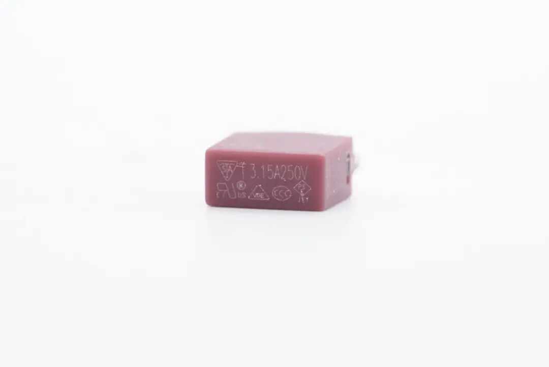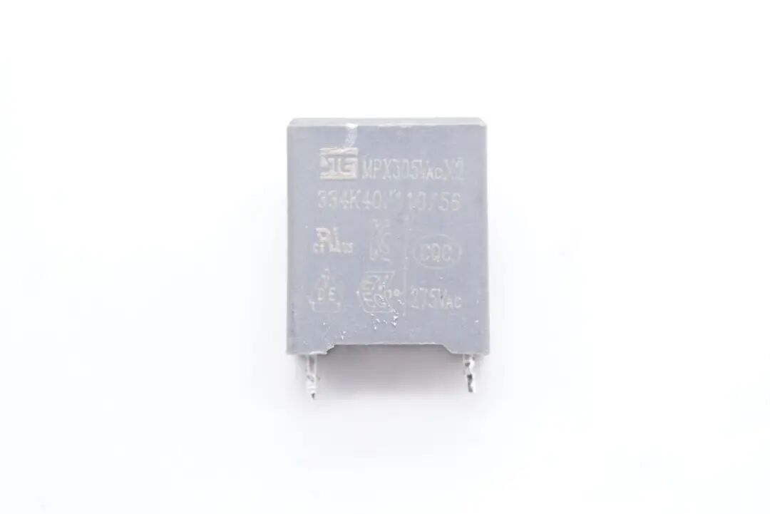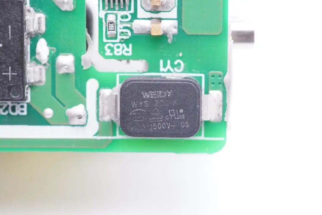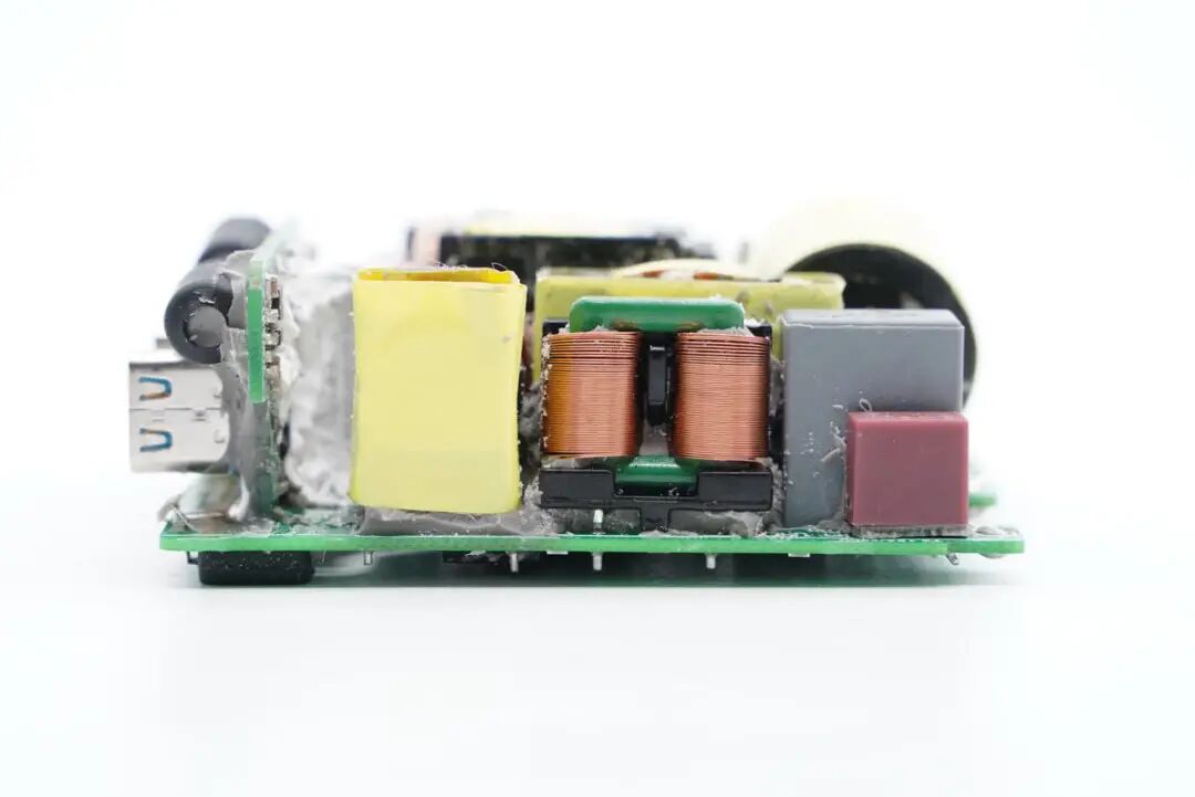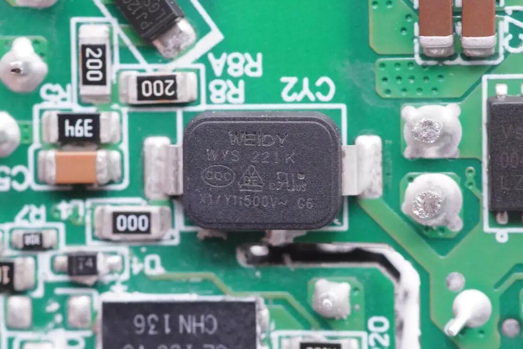 PCB板一侧设有保险丝、共模电感、安规X电容、滤波电容等器件,薄膜滤波电容包裹绝缘胶带。