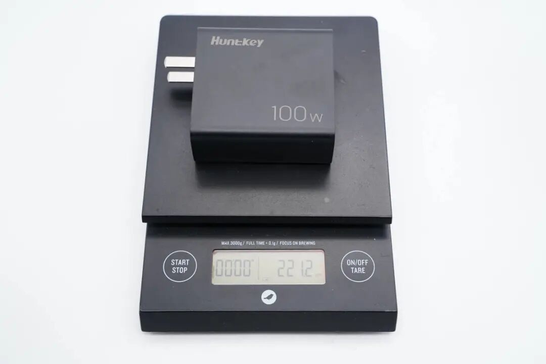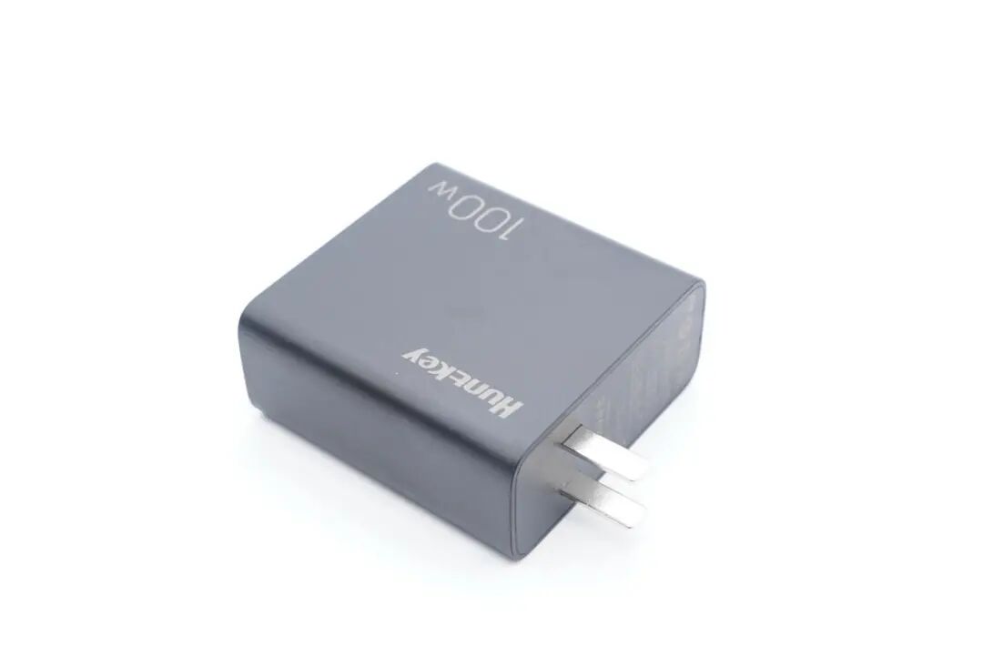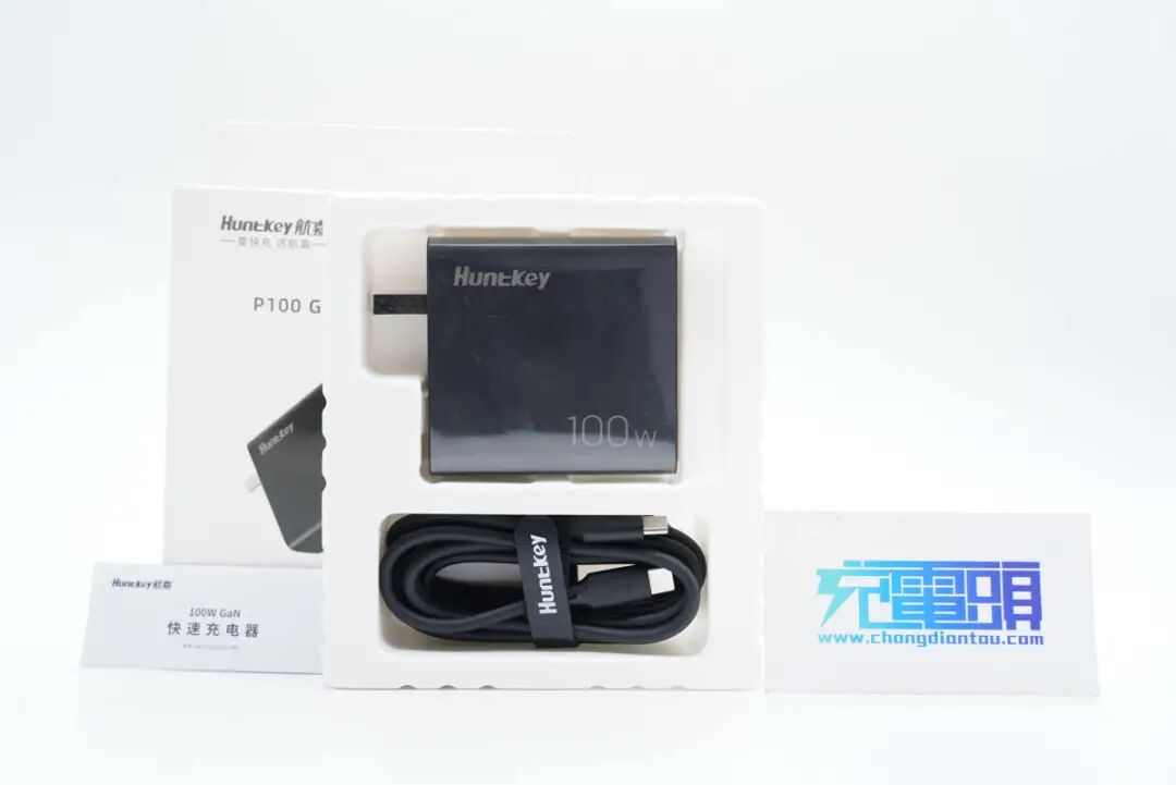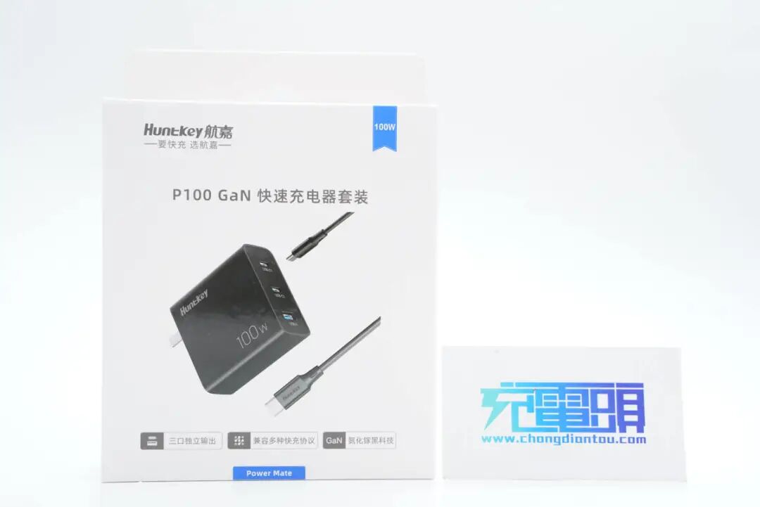 包装盒设计风格延续,正面印有HuntKey航嘉品牌、100W标识、充电器名称和外观图、三大卖点。