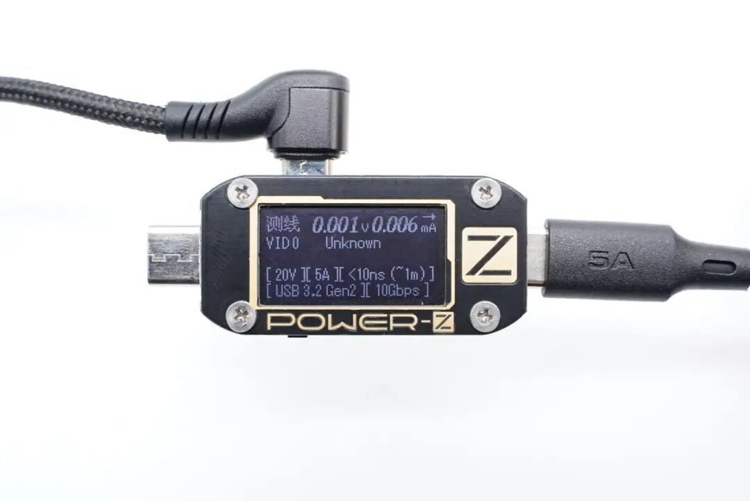 另外使用ChargerLAB POWER-Z KM001C测得该线缆带有E-Marker芯片,电力传输能力20V5A,即支持100W PD快充。