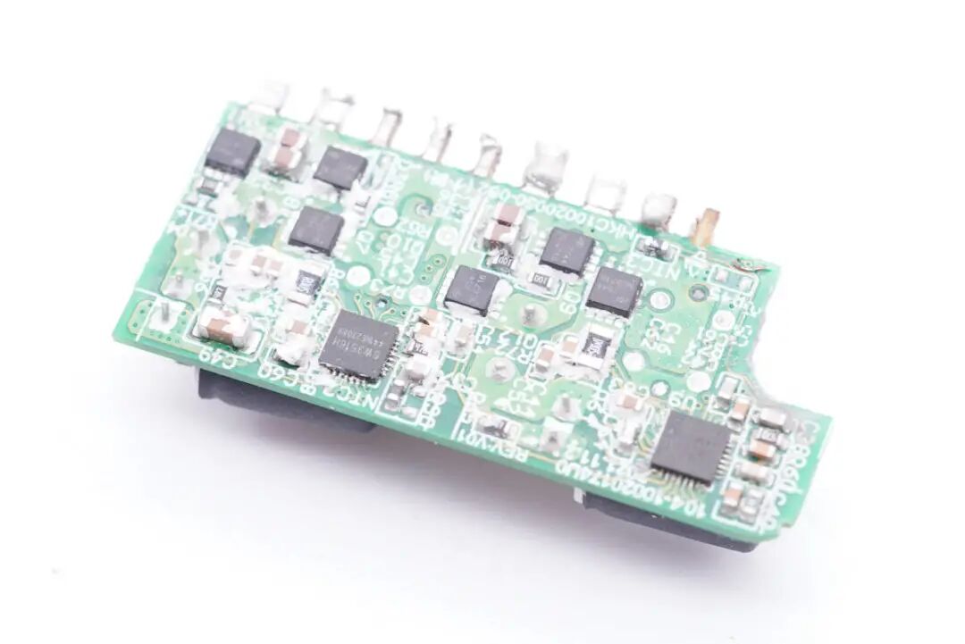 通过观察发现,这款充电器采用PFC+QR开关电源架构,输出端三口分别采用三路独立二次降压电路输出,输出功率智能分配。下面我们从输入端开始了解各器件的信息。