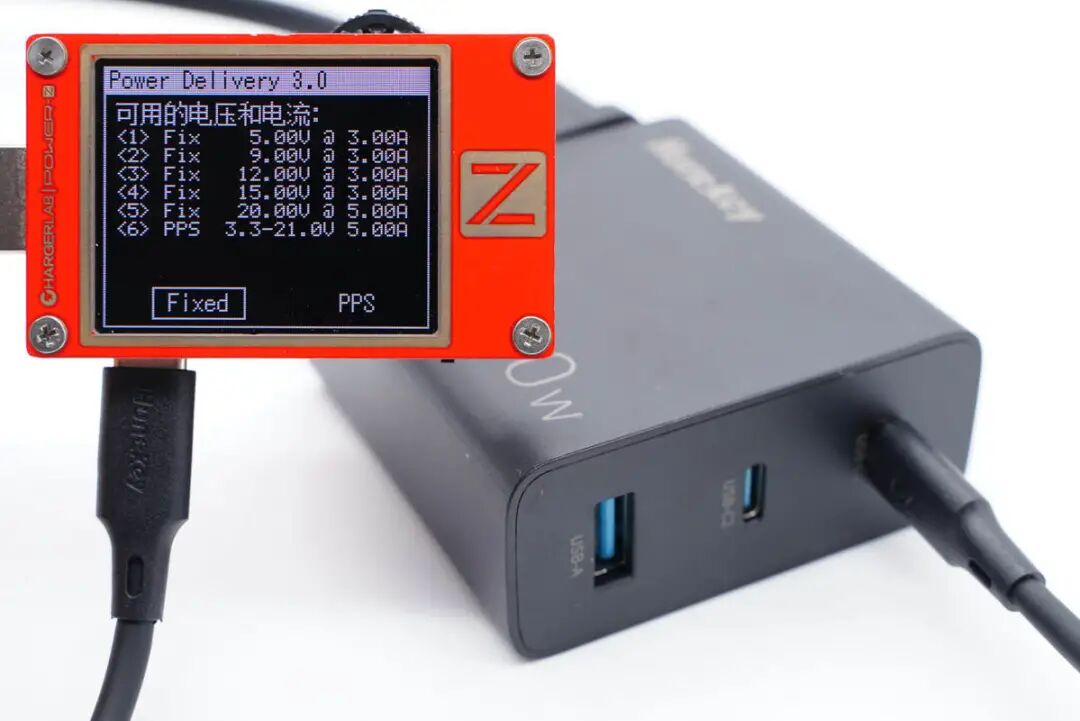 并且还具备5V3A、9V3A、12V3A、15V3A、20V5A五组固定电压档位,以及3.3-21V5A一组PPS电压档位。