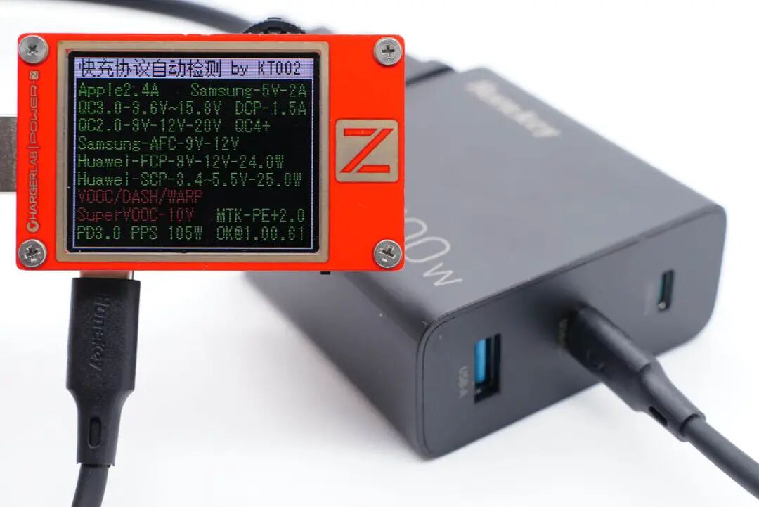 使用ChargerLAB POWER-Z KT002测得USB-C1口支持Apple 2.4A、Samsung 5V2A、DCP协议,以及QC2.0/3.0、AFC、FCP、SCP、PE2.0、PD3.0、PPS快充协议。