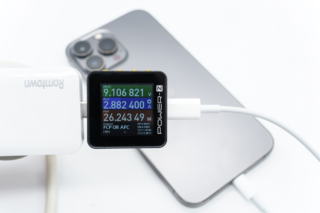 充电头网曾对iPhone 13全系列四款机型进行快充测试,最大功率可达26W以上。下面来实测一下Romtown 36W超薄快充对iPhone 13全系列的支持程度如何。
