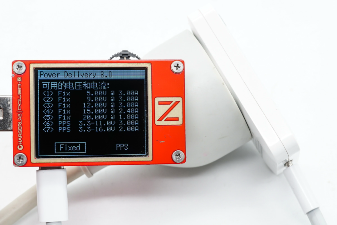 使用POWER-Z KT002 USB测试仪读取PDO报文,从屏幕中可以看到,充电器基于PD3.0快速充电标准开发,支持5V3A / 9V3A / 12V3A / 15V2.4A / 20V1.8A五个固定电压输出档,另外还包含3.3-11V3A / 3.3-16V2A两组PPS电压子集。