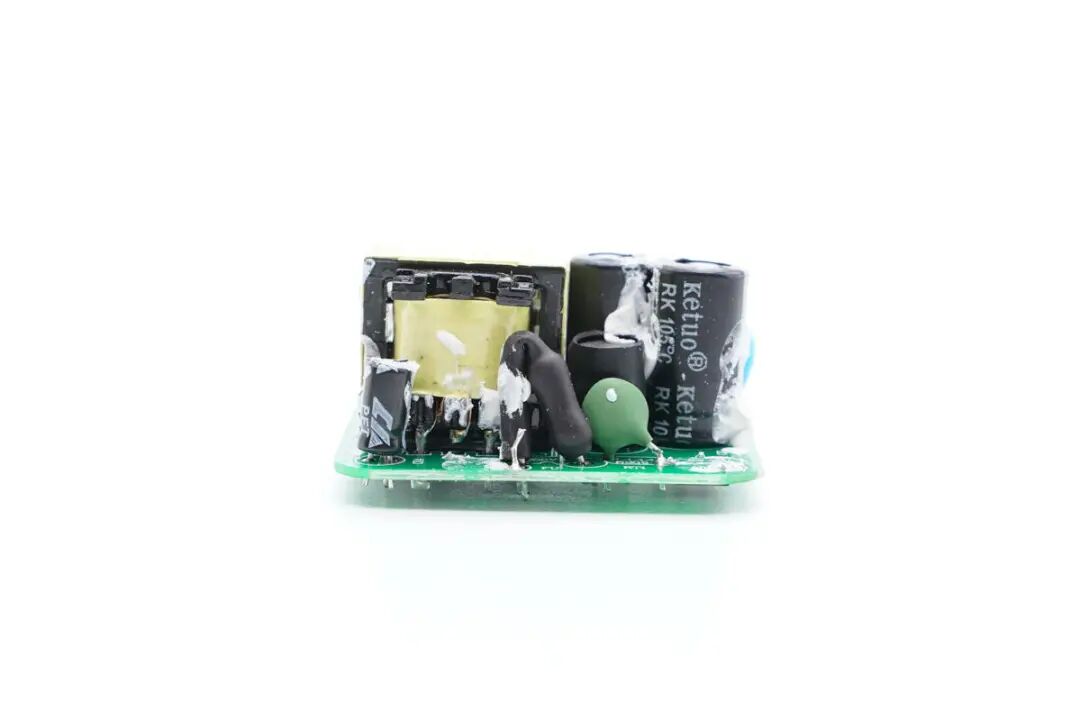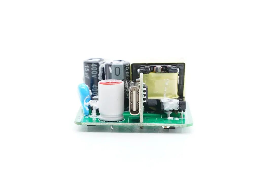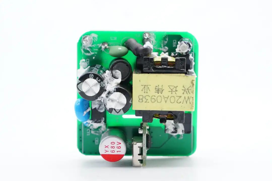 侧边设有初次级滤波电容、Y电容以及光耦。