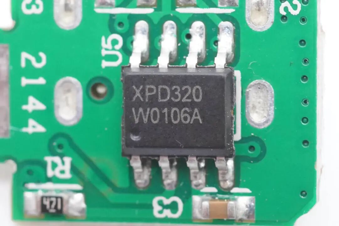 PD快充协议芯片采用云矽半导体XPD320。其支持QC2.0/3.0/3.0+、AFC、FCP、SCP、PD3.0和PPS等快充协议,PDO可配置5V、9V、12V,最大输出功率高至36W。支持过压/欠压保护,CC1/CC2/DP/DM 过压保护,采用ESOP8封装。