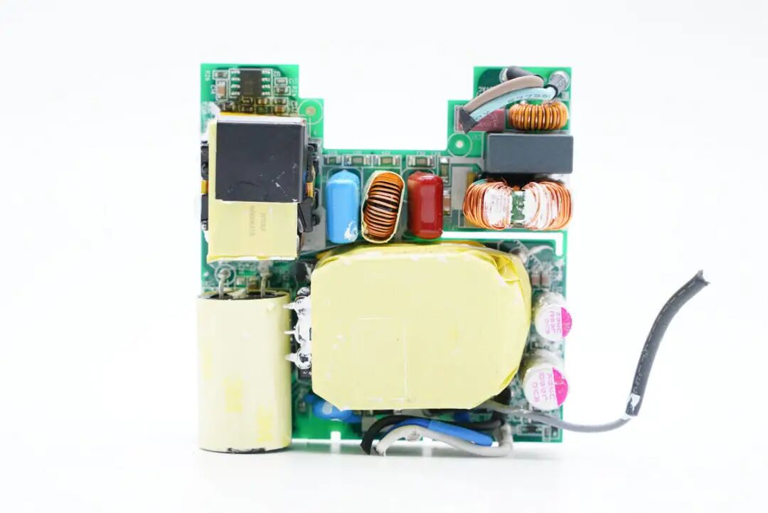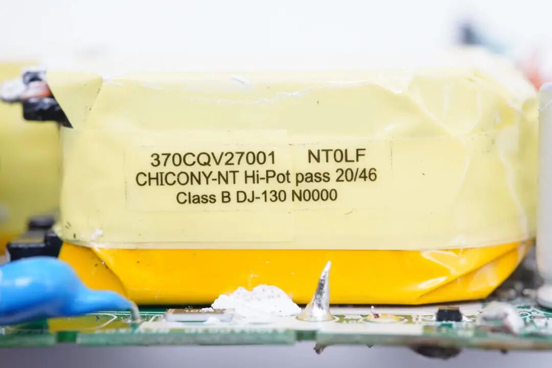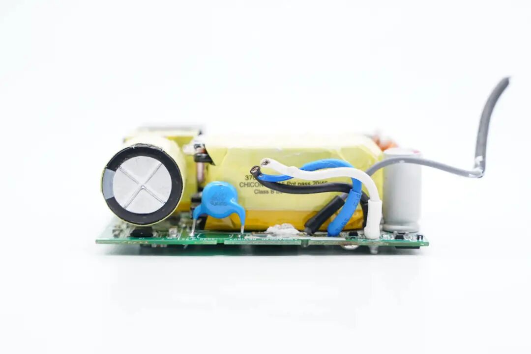 侧面横置一颗高压滤波电解电容,并包裹胶带保护,下方的板子上设有开关电源PWM控制器。