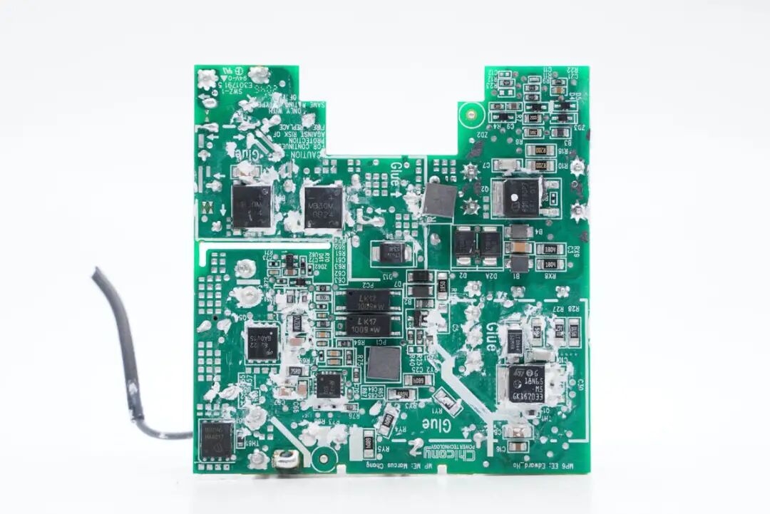 将白胶清理干净,板子前端区域设有输入EMI滤波和PFC升压电路的器件,另一区域设有开关电源电路的器件,布局清晰明了。