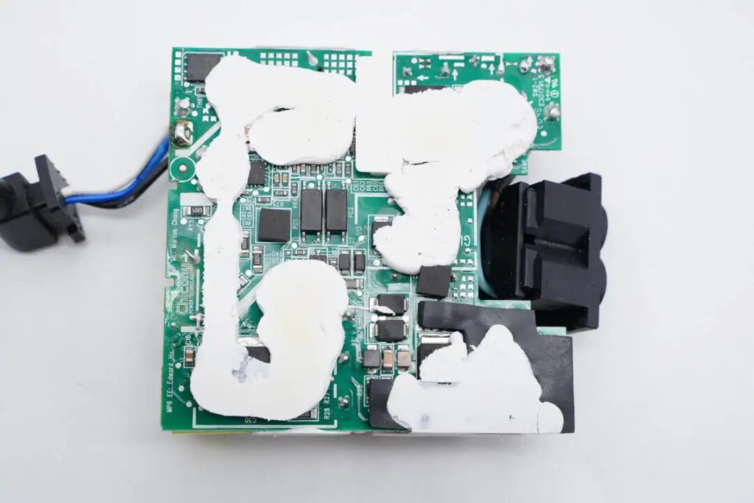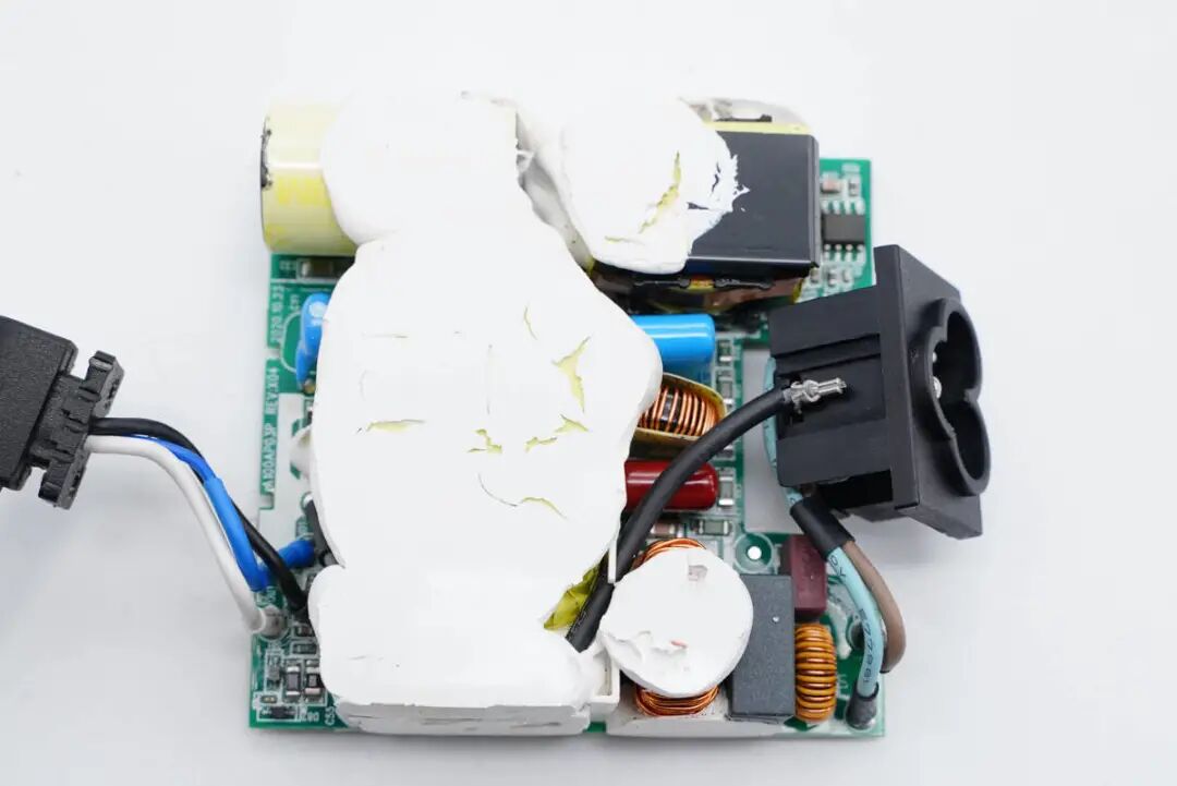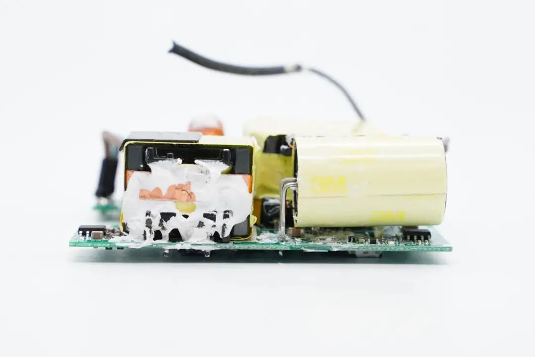 将散热片拆掉,两侧电容、中间变压器区域打胶填充处理。