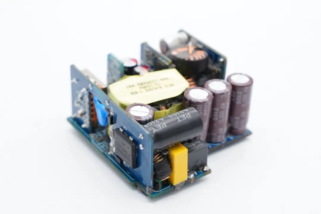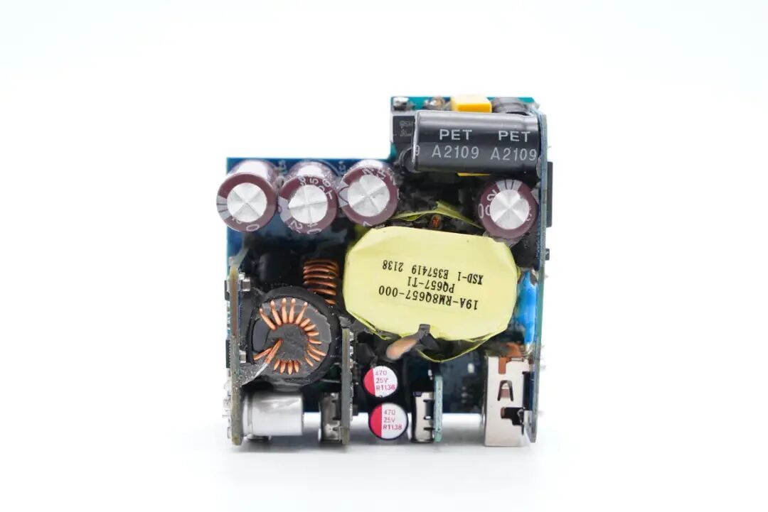 侧边小板中间区域焊接Y电容,从镂空处可以看到变压器。