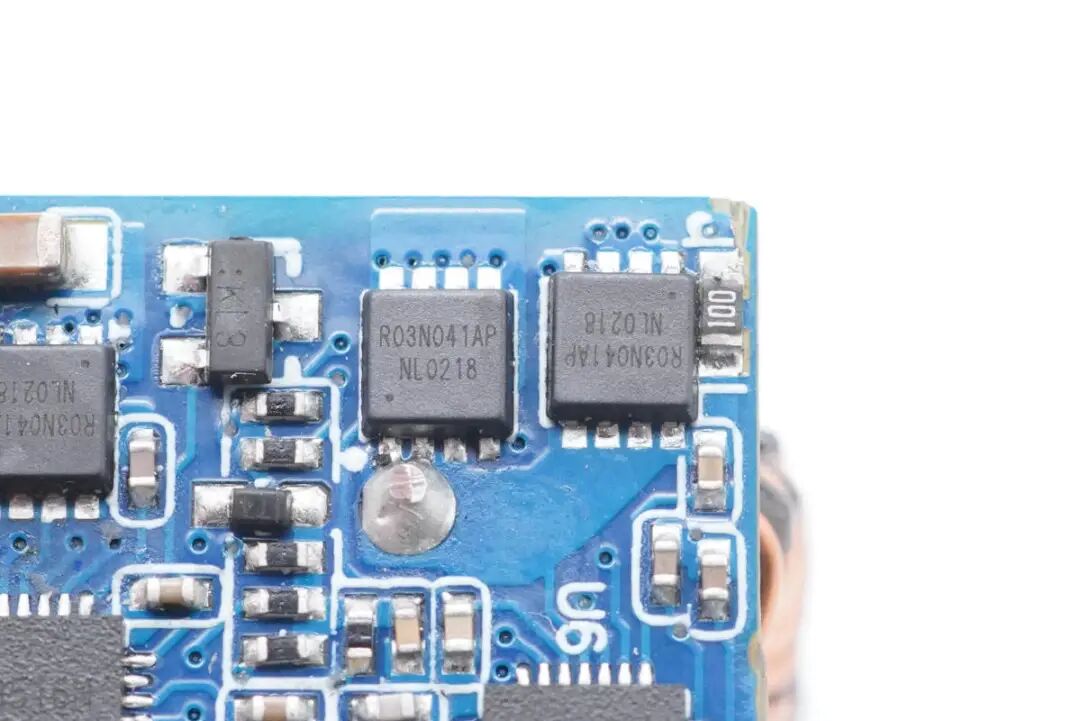 由智融SW3516H内置同步降压控制器控制两颗丝印R03N041AP的MOS管进行同步整流降压。
