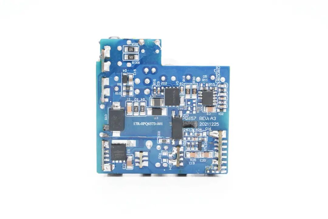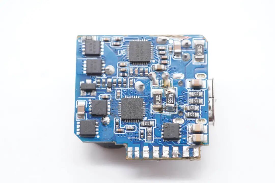 板子背面一览,贴片Y电容、光耦横跨初级次级,初级侧设有开关电源PWM控制和氮化镓功率开关管,次级设有同步整流管。