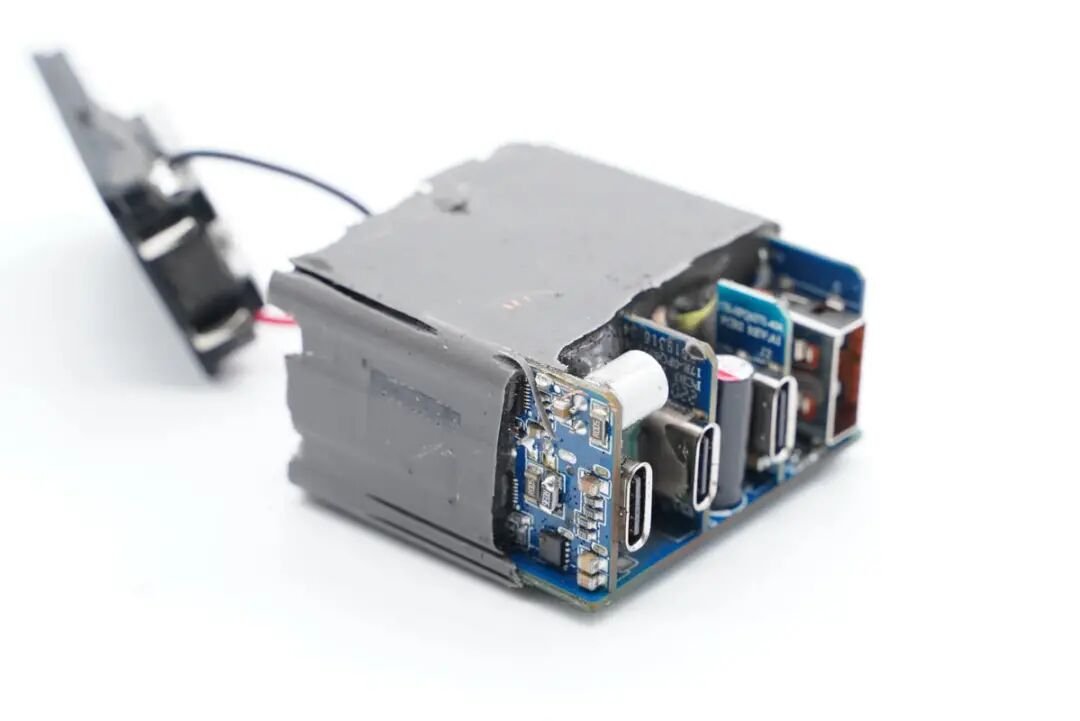 充电头网通过拆解发现,努比亚这款氮化镓能量块内置多块PCB小板,元器件布局紧凑,整个模块灌胶提升散热性能以及耐候性。