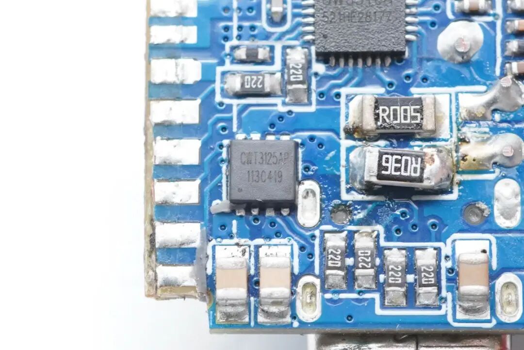 USB-C3口母座所在小板上也设有一路二次降压电路,C3口和A口共用,实现单口都能快充,双口同时输出则为5V3A。小板正面设有MOS管、降压电感以及滤波固态电容。