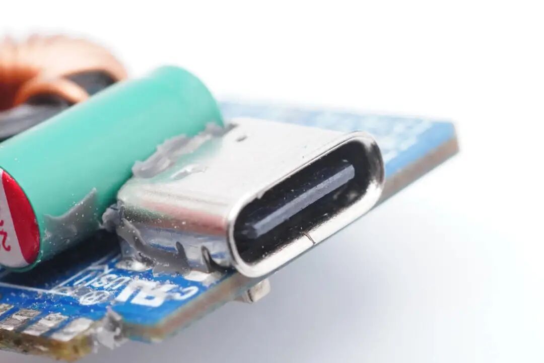 USB-C1口母座特写,卷边设计,过孔焊接,黑色胶芯不露铜。