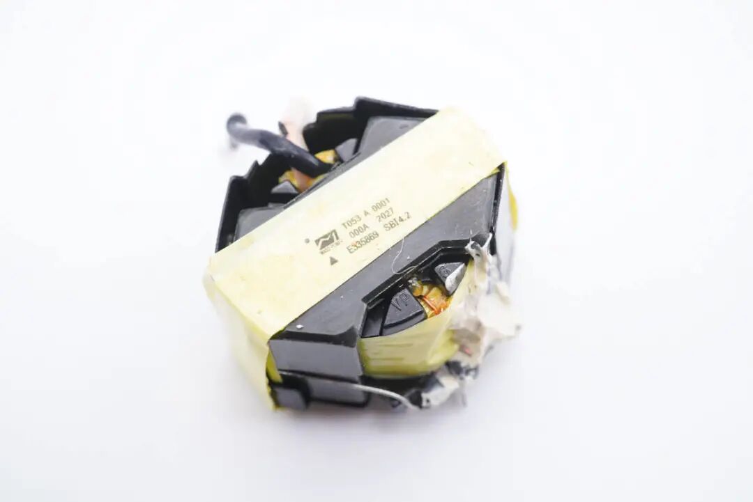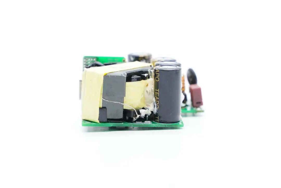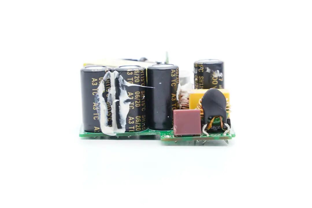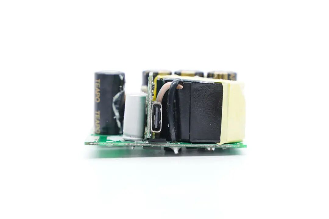 输出端一览,USB-C母座焊接在小板上,下方有一颗肖特基二极管,此外和变压器间有绝缘板进行隔离。