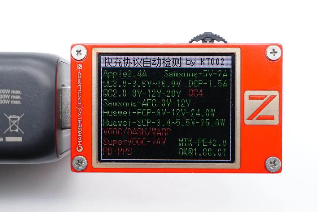 使用ChargerLAB POWER-Z KT002测得USB-C1口支持Apple 2.4A、Samsung 5V2A、DCP协议,以及QC2.0/3.0、AFC、FCP、SCP、PE2.0、PD3.0、PPS多个快充协议。