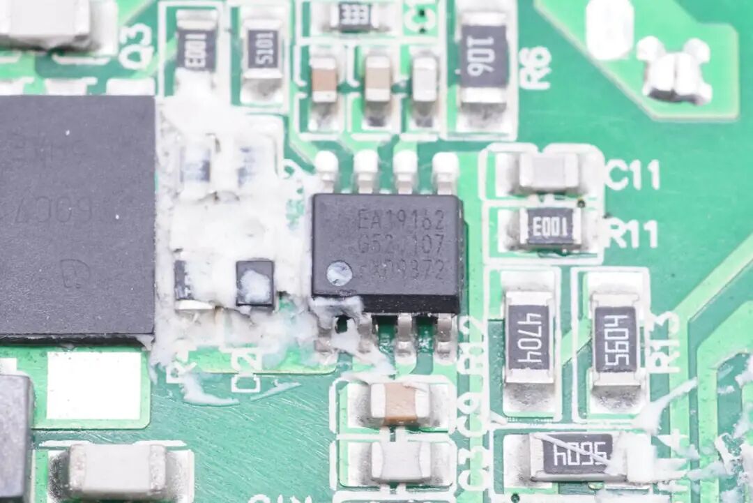 取出内部PCB模块,可见正面贴有一块绝缘麦拉片,输入端元器件使用打胶固定。