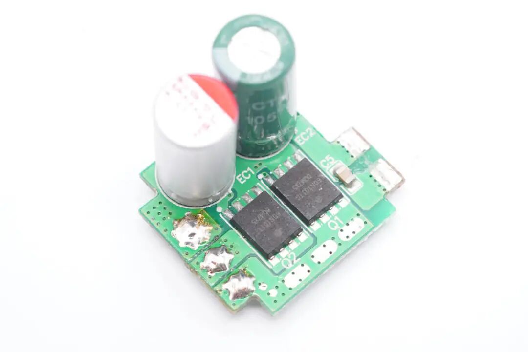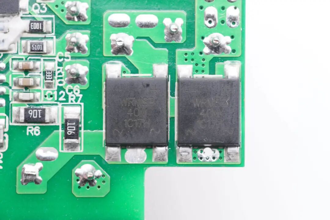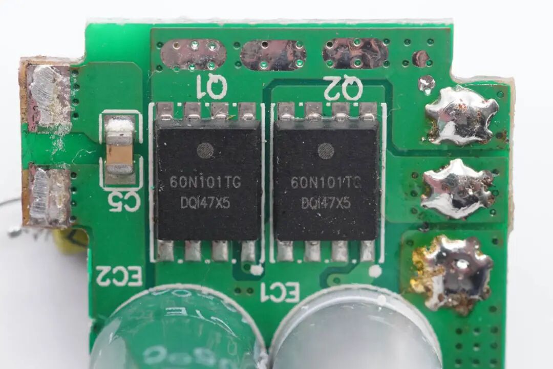 将同步整流电路所在PCB板拆下来,正面设有两颗滤波电容和两颗MOS管。