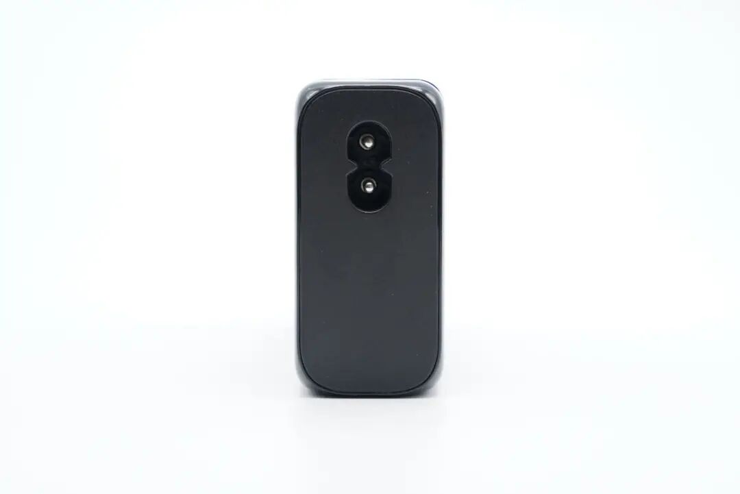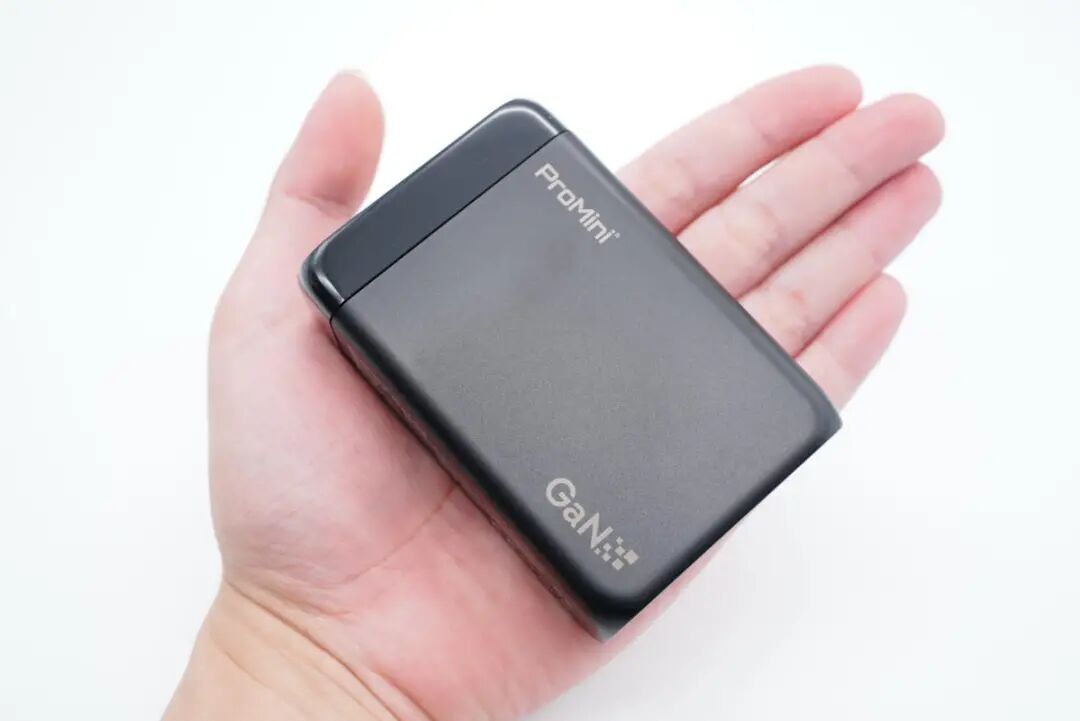 整个充电器采用了纯黑色外壳,两段式机身,主体部分为哑光工艺,正面印有ProMini以及GaN字样,输入端为亮面处理。